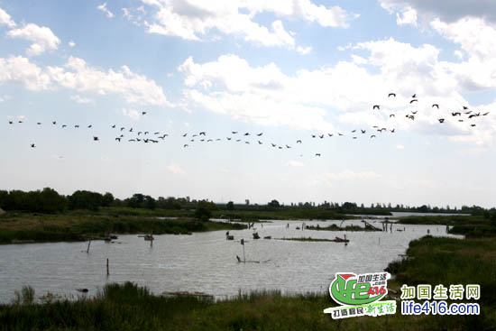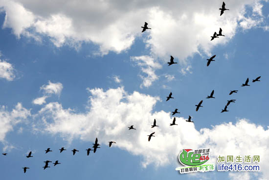 在Tommy Thompson Park 随处可见这样排成长队在湖面上飞行的鸟群。