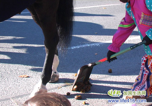 一件有趣的事,马队来到我们摄像机跟前,离我们最近的这匹马开始“放肆”起来——随地大便,好在跟在马队后的工作人员很快把马粪清扫干净,一边扫,还一边喊呢:“新鲜干净的马粪啊,一块钱一大筐……”。